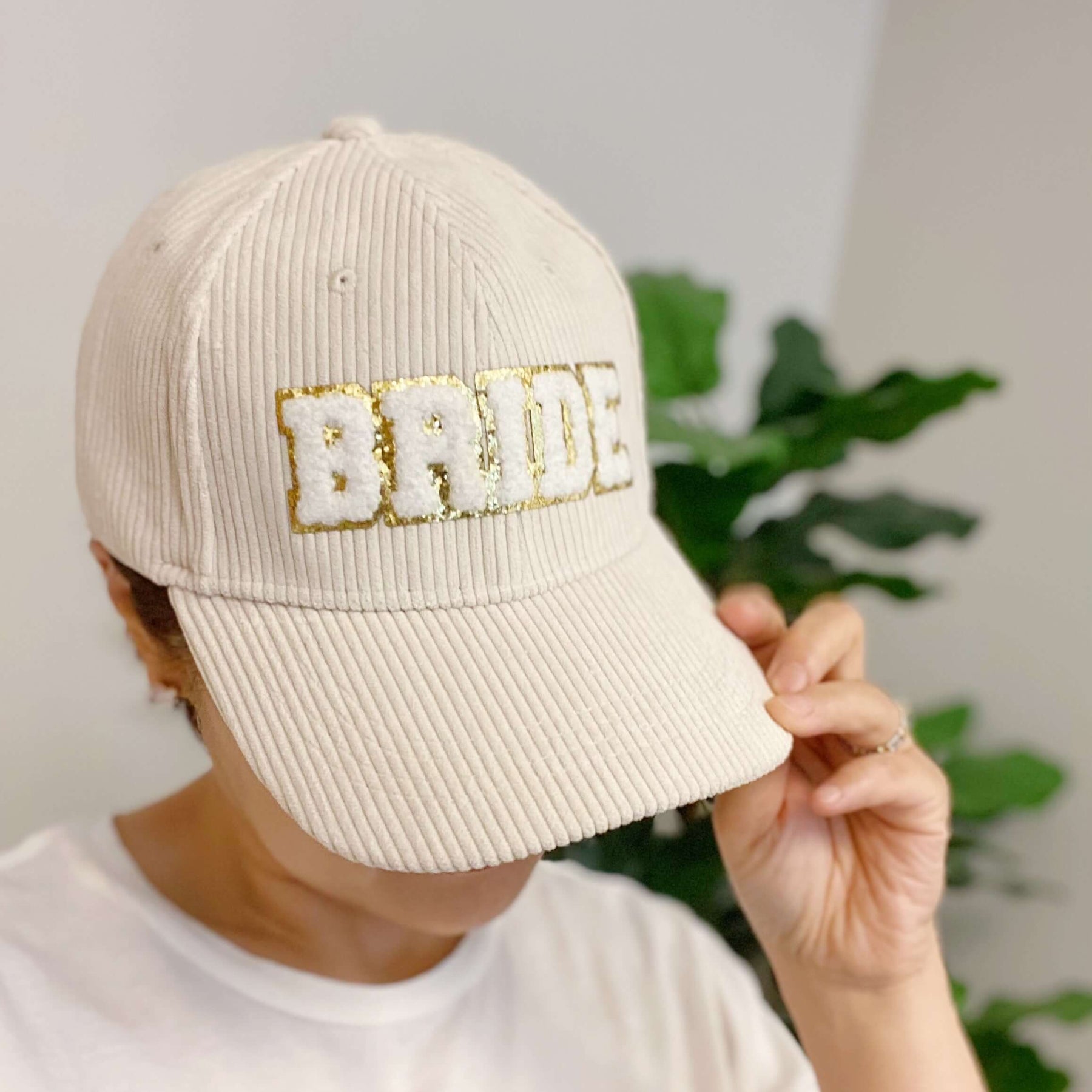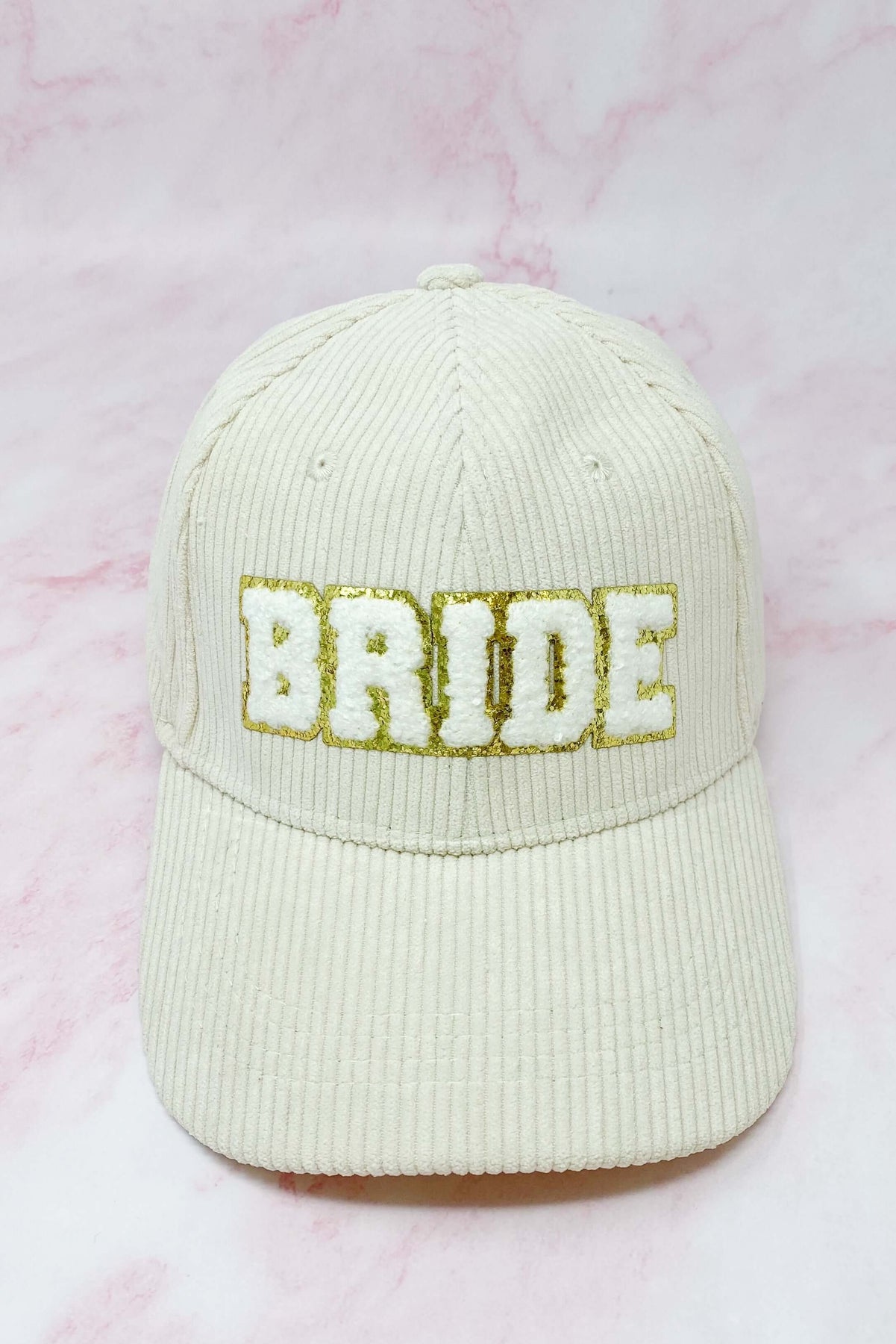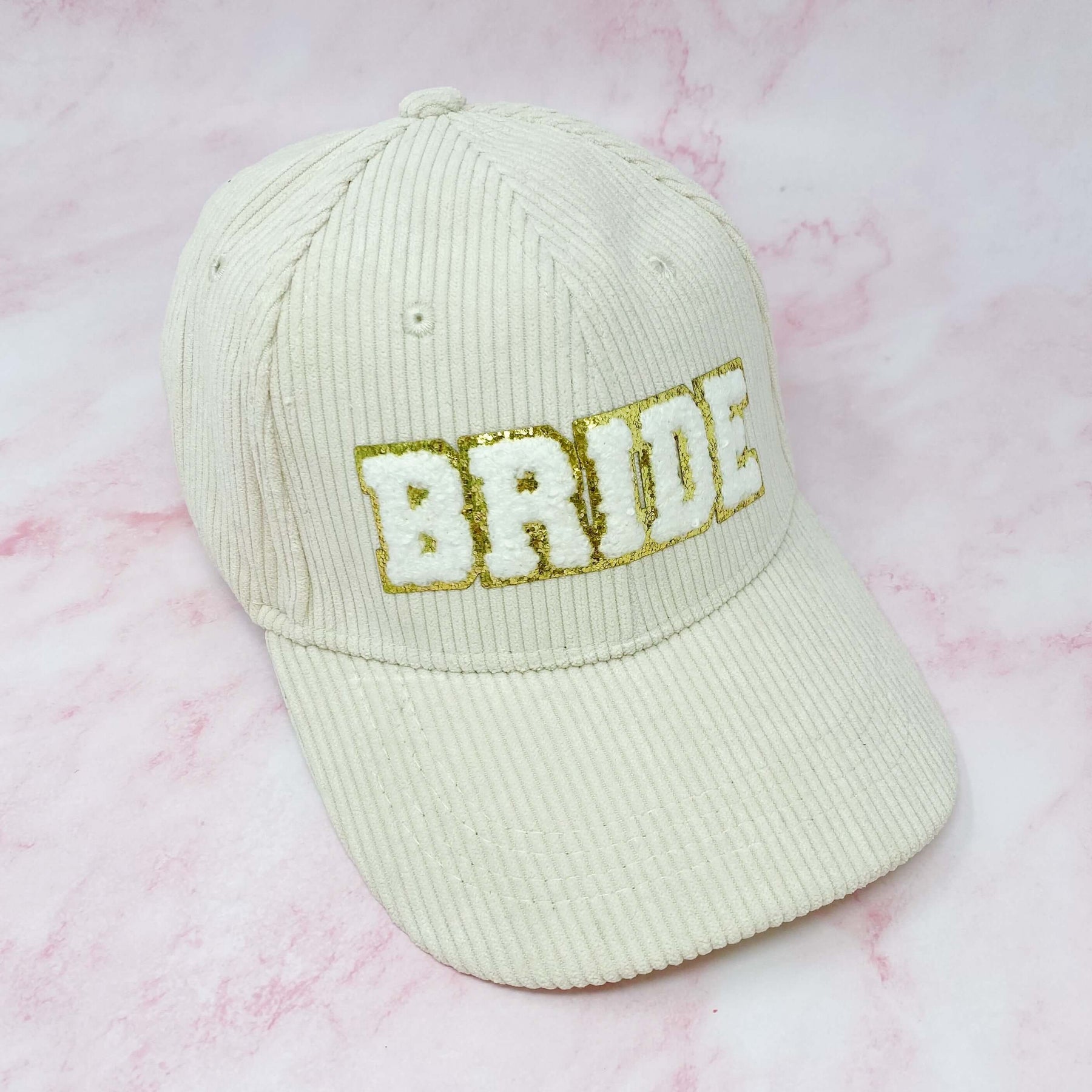 Adorable corduroy BRIDE ball cap with gold glittering fuzzy patch lettering! Has great fit with perfect curved brim. Clip closure on the back to adjust size and hidden pocket for seamless look. Great details all around.
