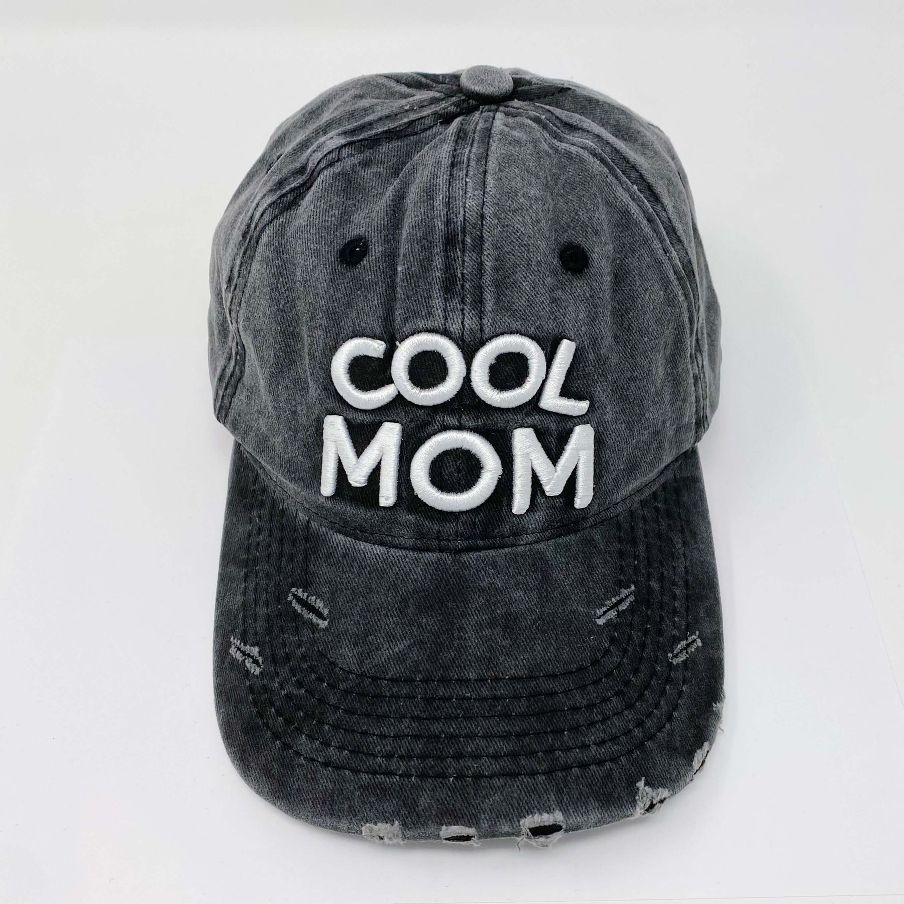 This is only for COOL MOM, not for the regular mom! Neutral dark gray distressed base ball cap with white embroidery on the front.