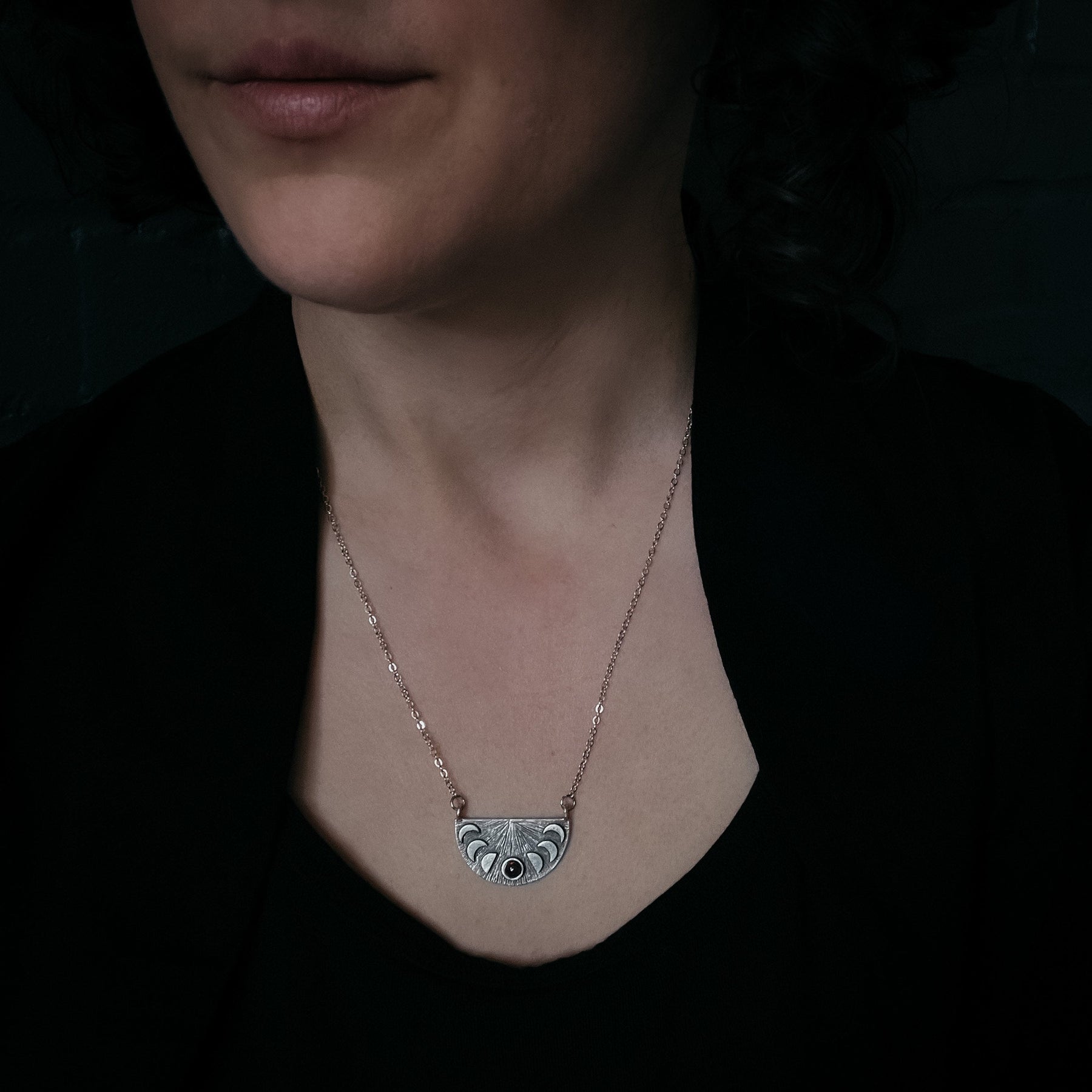 Inspired by a lunar eclipse and blood moons, this half moon semicircle pendant features the phases of the Moon and set with a flashy black opal to represent the moon going into full eclipse. A beautiful gift for any stargazer! Please click the other tabs for more product details.