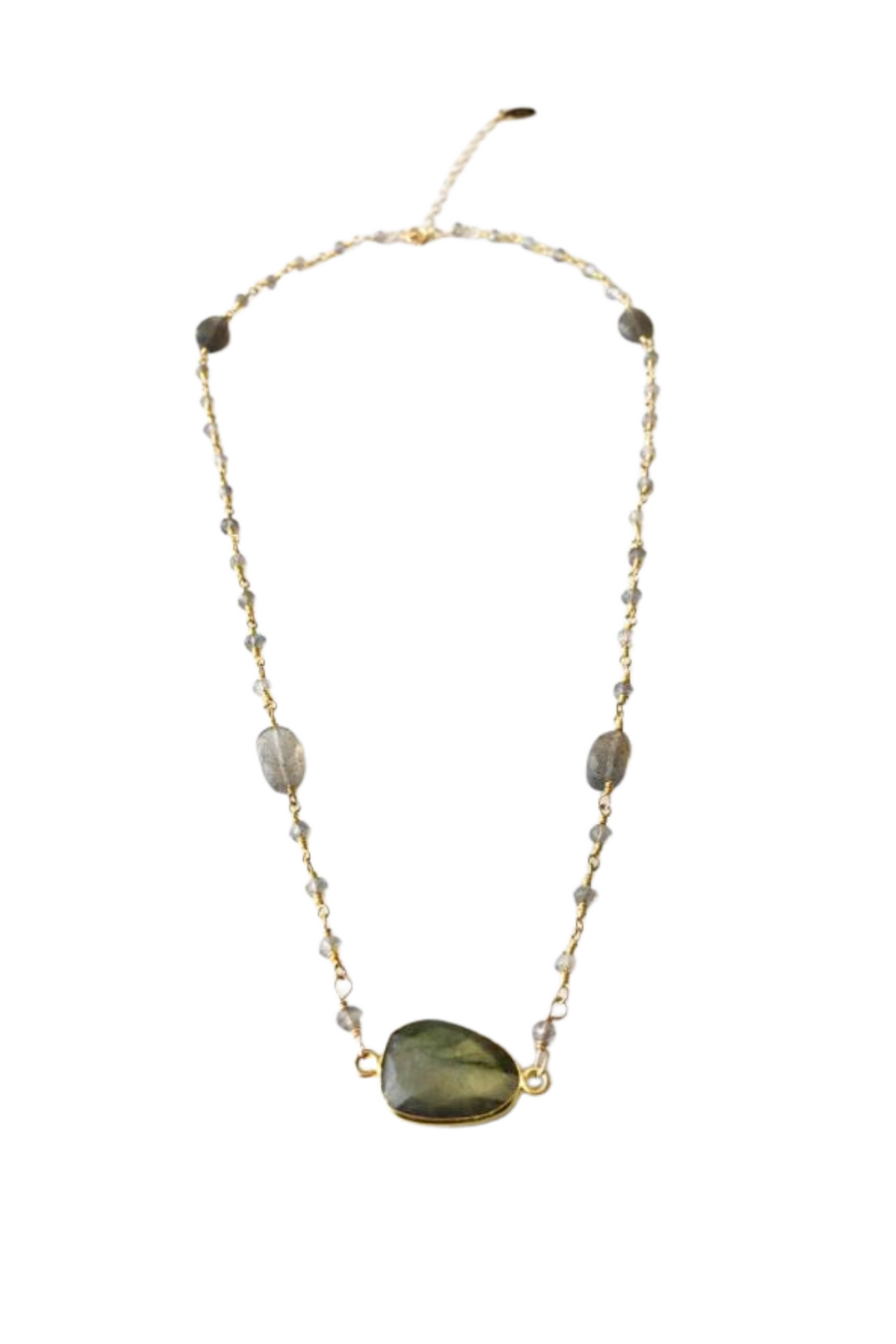 A semi-precious labradorite stone set in a 14k gold fill bezel sitting on a semi-precious labradorite beaded gold chain with a 14k gold fill clasp.