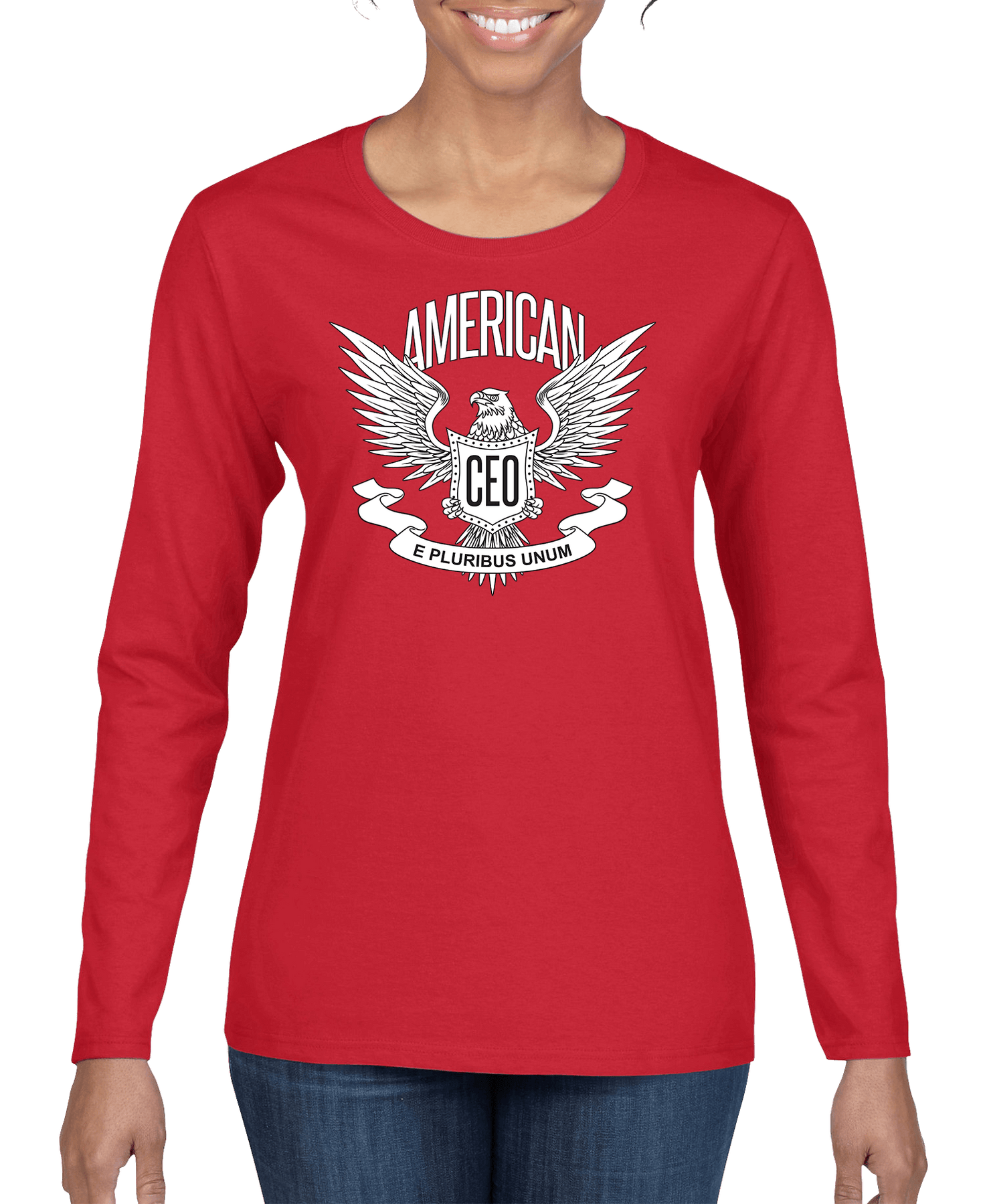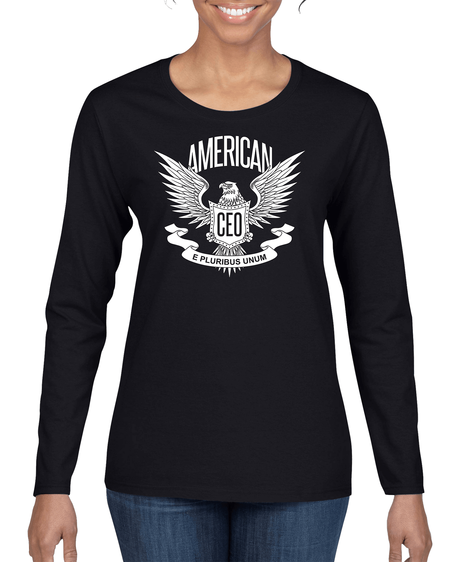 The "American CEO Patriotic Eagle" design for the Women's Long Sleeve Shirt showcases a powerful eagle, a stylized American flag, and patriotic symbols. It represents strength, and leadership, and celebrates women in leadership roles.